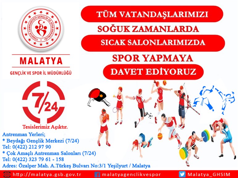 Cumhurbaşkanlığımızın 100 günlük eylem planı kapsamında her yaştaki vatandaşın günün her saatinde aktif spor yapmaları amacı ile Gençlik ve Spor Bakanlığı tarafından hayata geçirilen 'Soğuk Zamanlarda Sıcak Salonlarımızda Spor' projesi ile Malatya’da Gençlik ve Spor İl Müdürlüğüne bağlı Çok Amaçlı Spor Salonu ve Beydağı Gençlik Merkezi Spor Salonunda 7/24 açık şekilde halkımıza hizmet vermeye başladı.