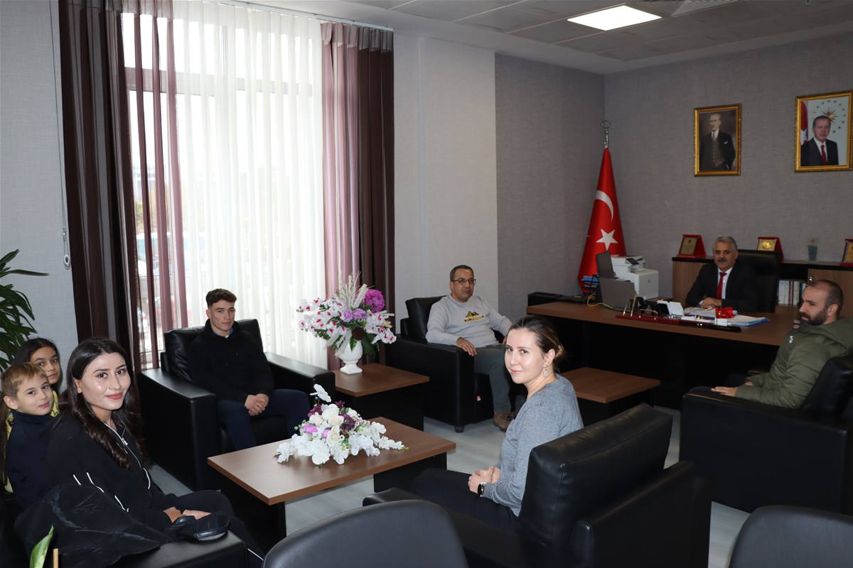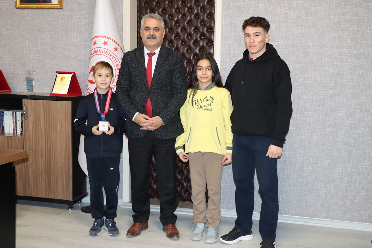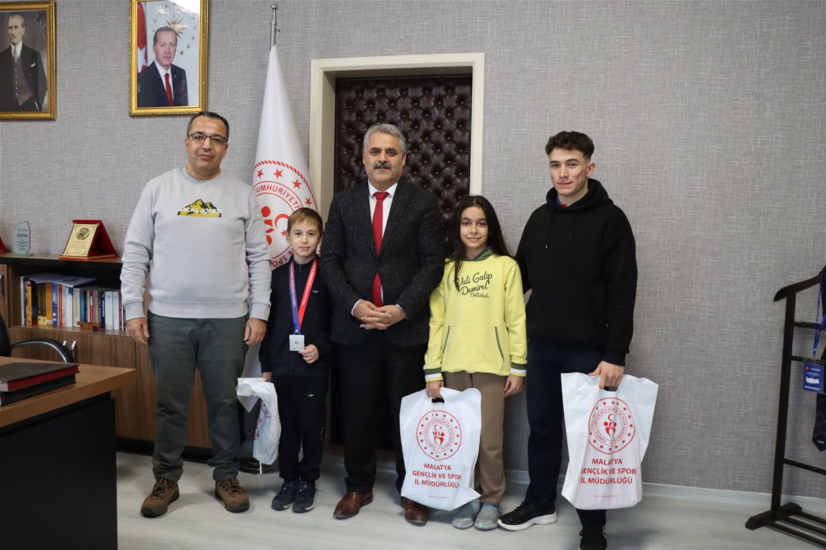27-30 Kasım 2025 tarihleri arasında Mersin ilinde yapılan Cimnastik – Parkur Türkiye Şampiyonasında Minik Erkekler kategorisinde Türkiye ikincisi olan sporcumuz İbrahim Batuhan Sarıbaş ve ailesi, Türkiye altıncısı olan Baran Berat Bingöl ( Genç Erkekler ), Türkiye yedincisi olan Buğlem Ada Kürüm ( Küçük Kadınlar ) ve antrenörlerimiz, İl Müdürümüz Ebu Bekir KAYHAN’ ı makamında ziyaret ettiler. Ziyaret sırasında İl Müdürümüz Ebu Bekir KAYHAN sporcu ve antrenörlerimizi tebrik edip, başarılar dileyerek, çeşitli hediyeler verdi.